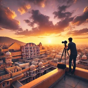 A breathtaking rooftop view of Jaipur, India, taken from a high vantage point during sunset. The cityscape features historic architecture.