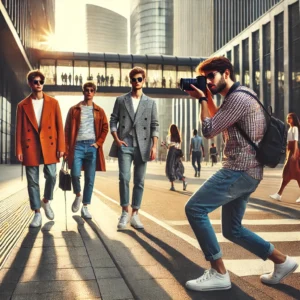 A professional street fashion photographer capturing stylish individuals in an urban setting. The scene includes trendy models walking confidently.