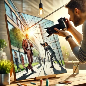 • A professional candid photography setup emphasizing angles and composition. The scene features a photographer capturing a subject from a unique angle